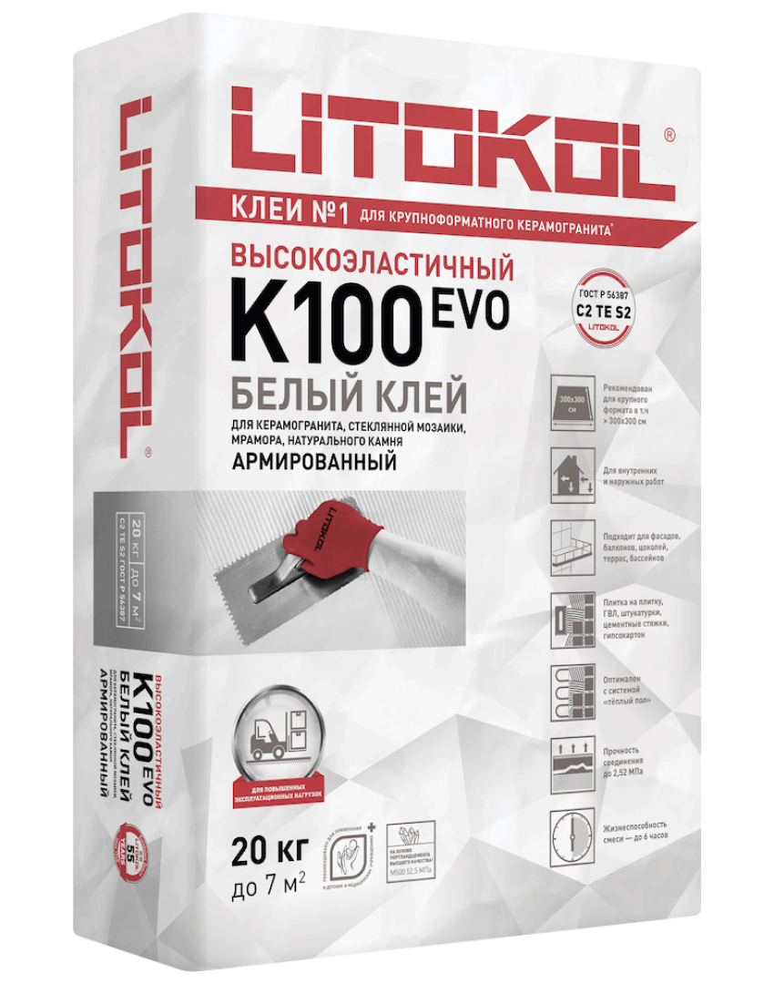Клей белый фиброармированный высокоэластичный тиксотропный для керамической плитки, керамогранита и камня более 300х300 см.